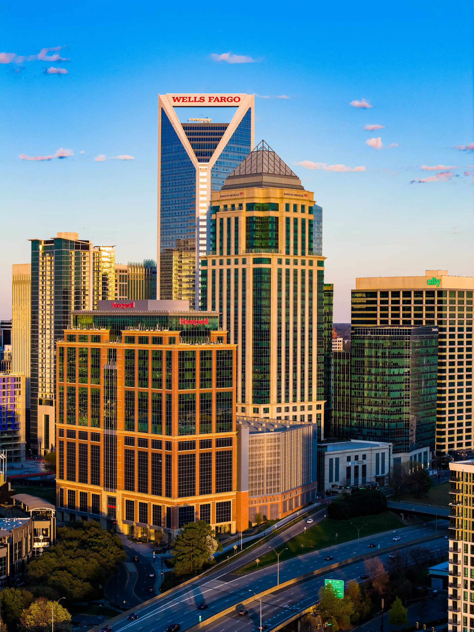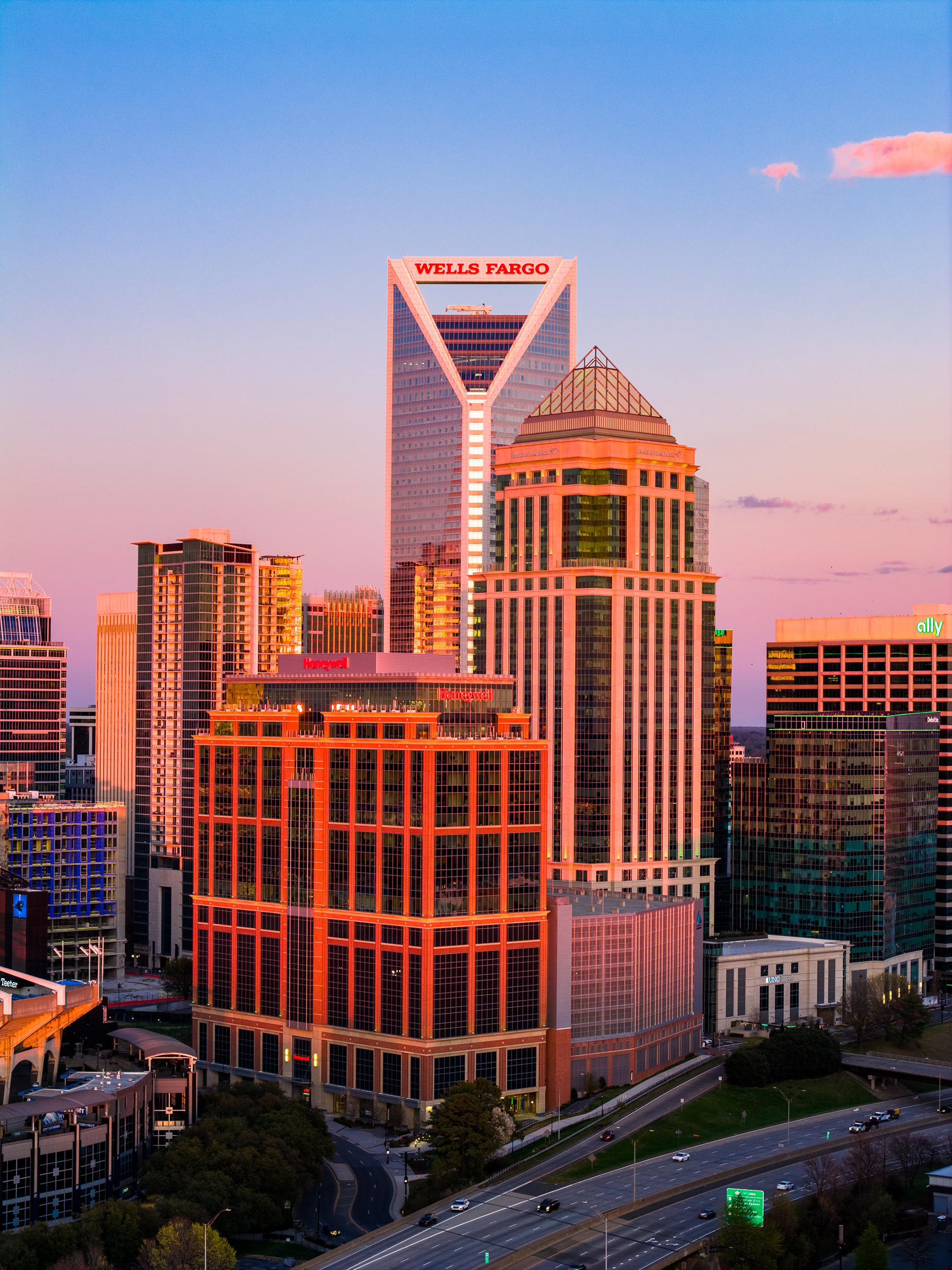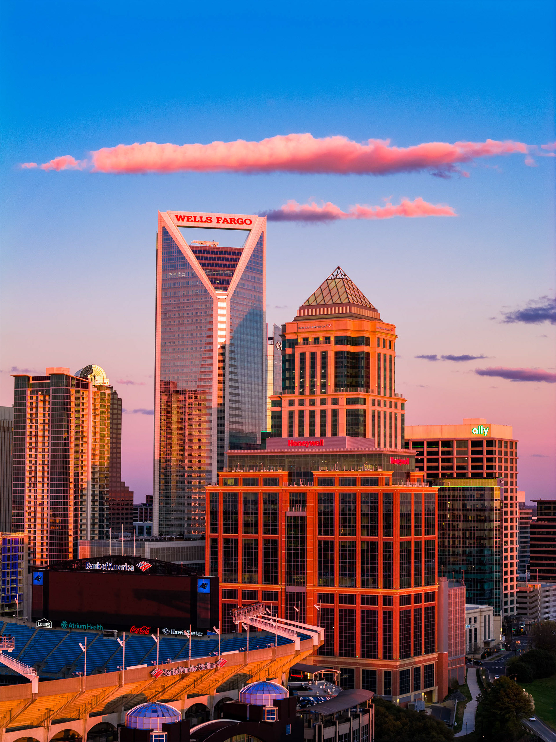 This project features a comprehensive collection of professional drone photography and cinematography captured over Uptown Charlotte on March 17, 2026. The series focuses on the architectural heart of the Queen City, utilizing the dramatic transition from golden hour to twilight to highlight the textures and elevations of the skyline. Primary subjects include the iconic Wells Fargo "handlebar" building, the Honeywell and Bank of America corporate offices, and the expansive footprint of Bank of America Stadium, all framed against the shifting colors of a North Carolina sunset.