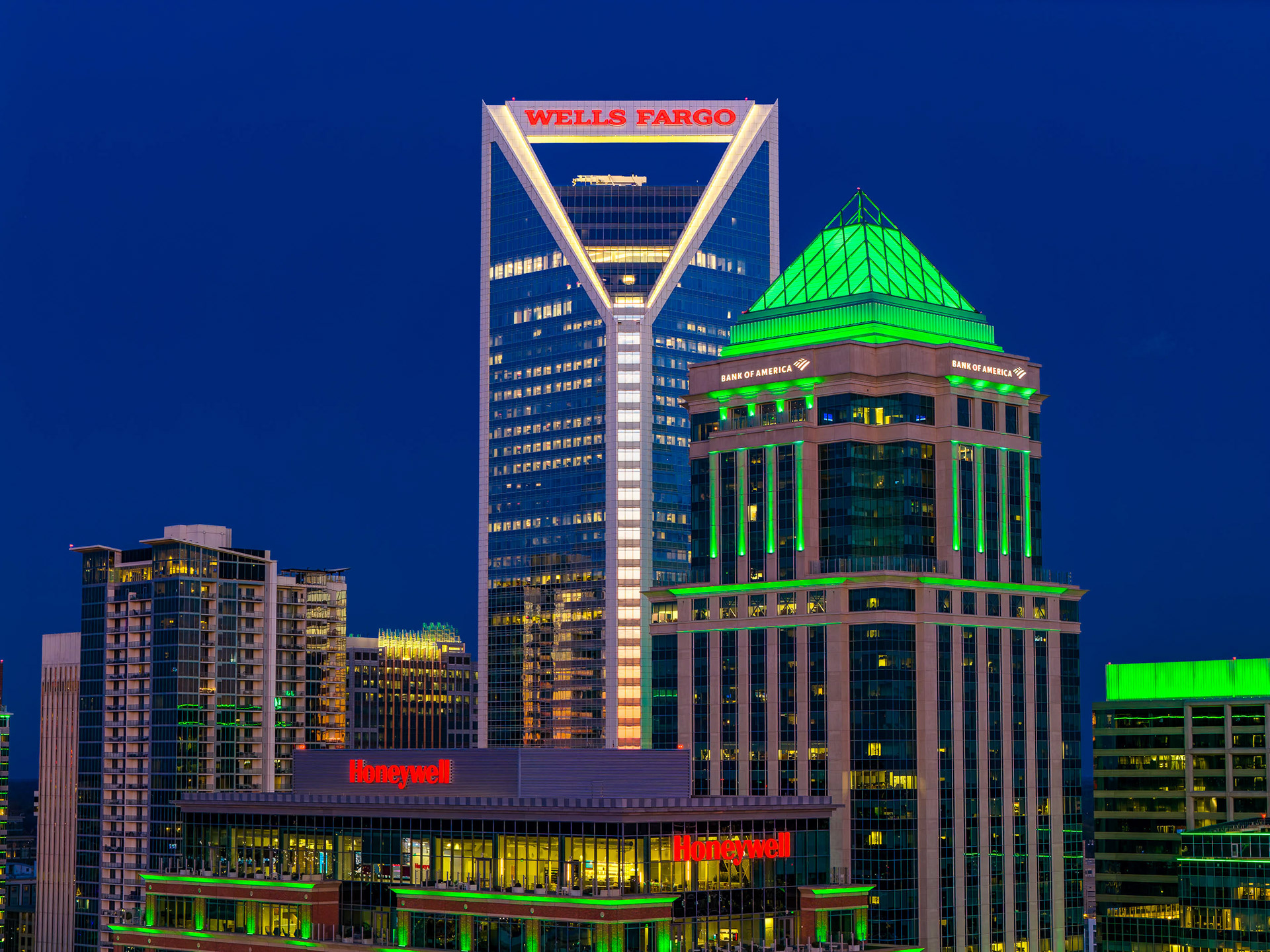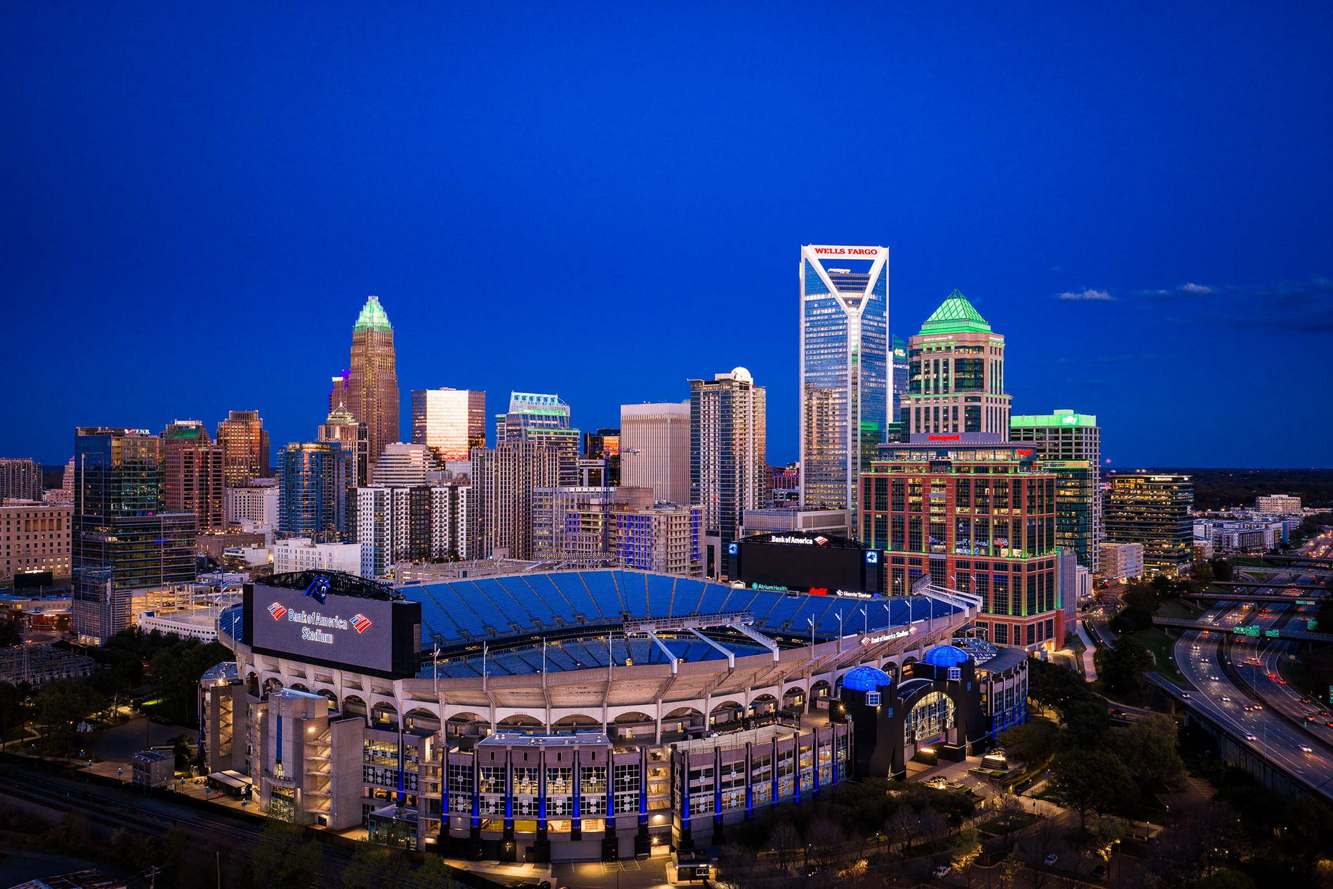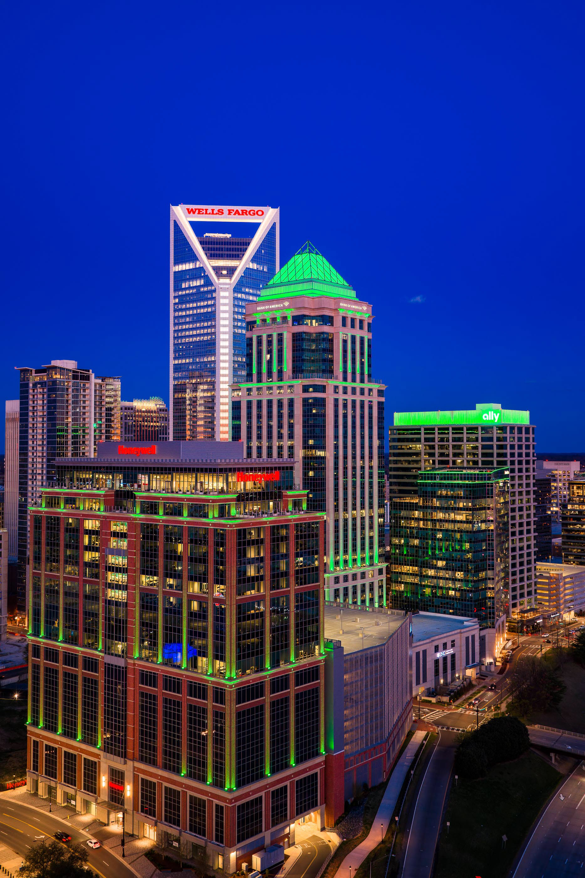 This project features a comprehensive collection of professional drone photography and cinematography captured over Uptown Charlotte on March 17, 2026. The series focuses on the architectural heart of the Queen City, utilizing the dramatic transition from golden hour to twilight to highlight the textures and elevations of the skyline. Primary subjects include the iconic Wells Fargo "handlebar" building, the Honeywell and Bank of America corporate offices, and the expansive footprint of Bank of America Stadium, all framed against the shifting colors of a North Carolina sunset.