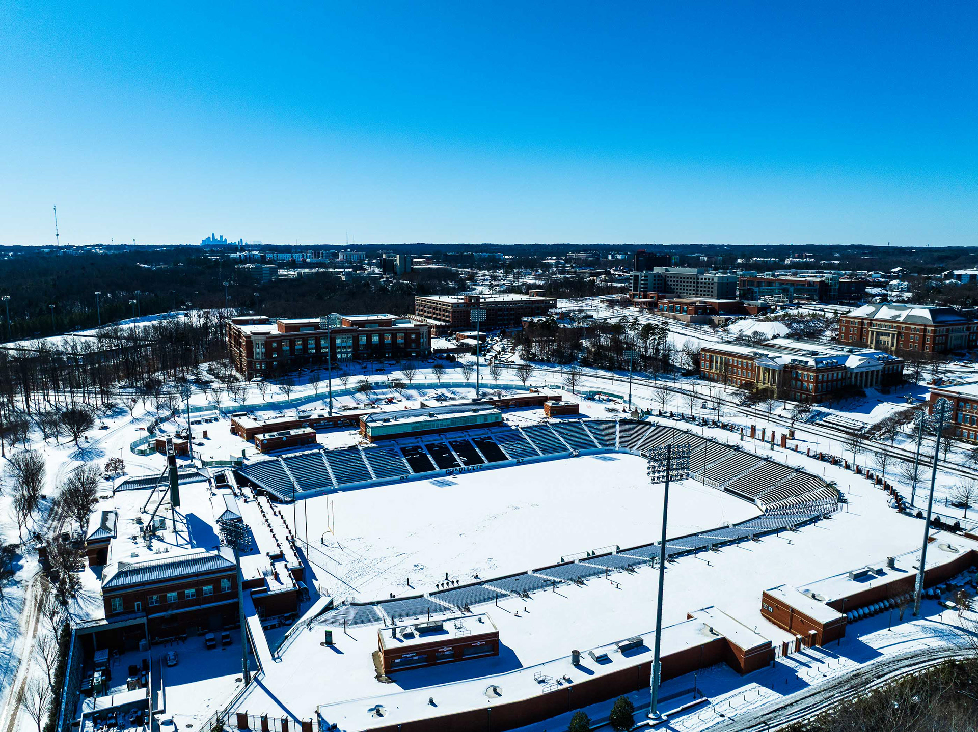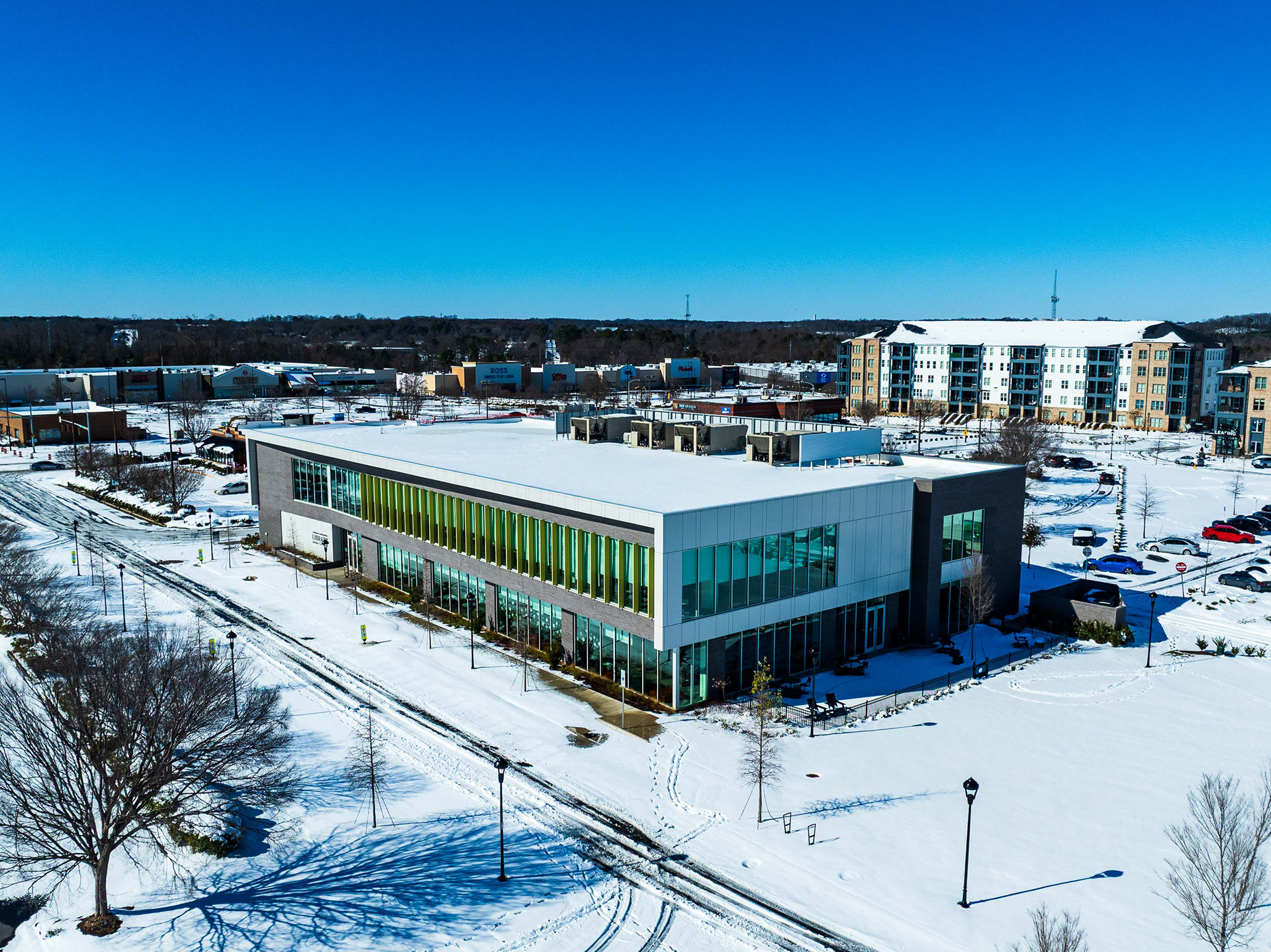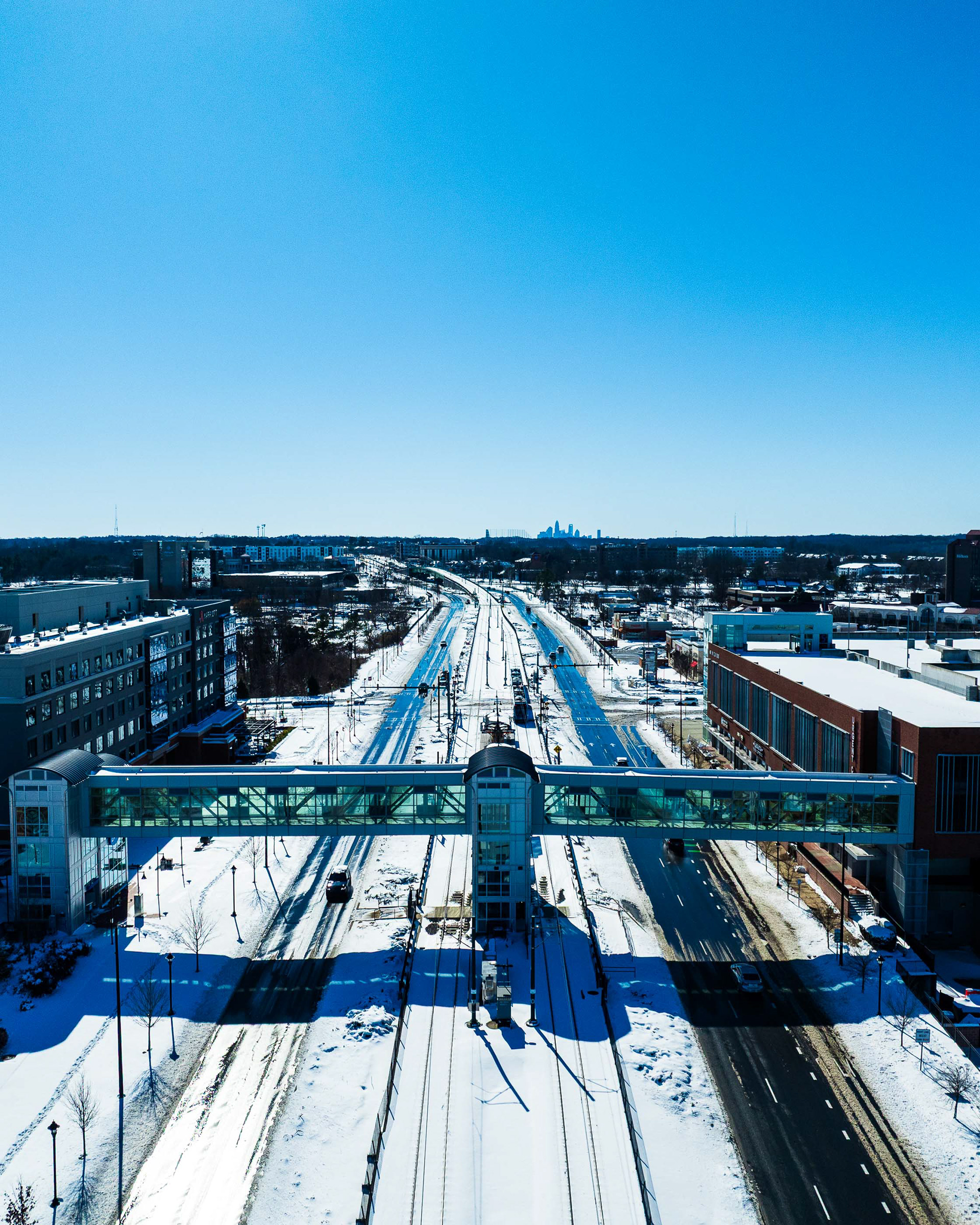 From the snow-dusted bleachers of Jerry Richardson Stadium at UNC Charlotte to the vibrant red roofs of the Shoppes at University Place, these high-resolution captures provide a fresh perspective on a local landmark. The series highlights key community anchors, including the University City regional library and the transit-oriented infrastructure of the Blue Line extension.