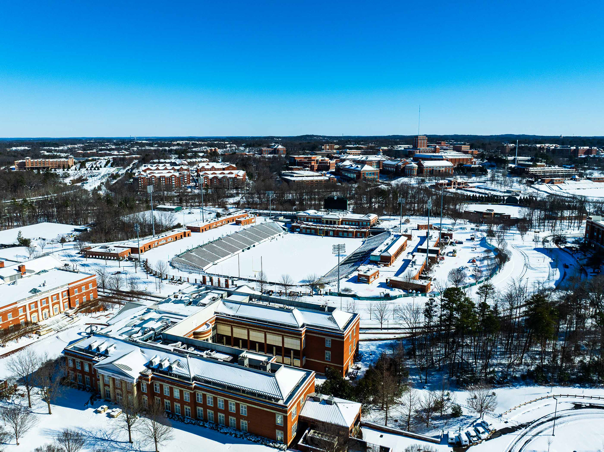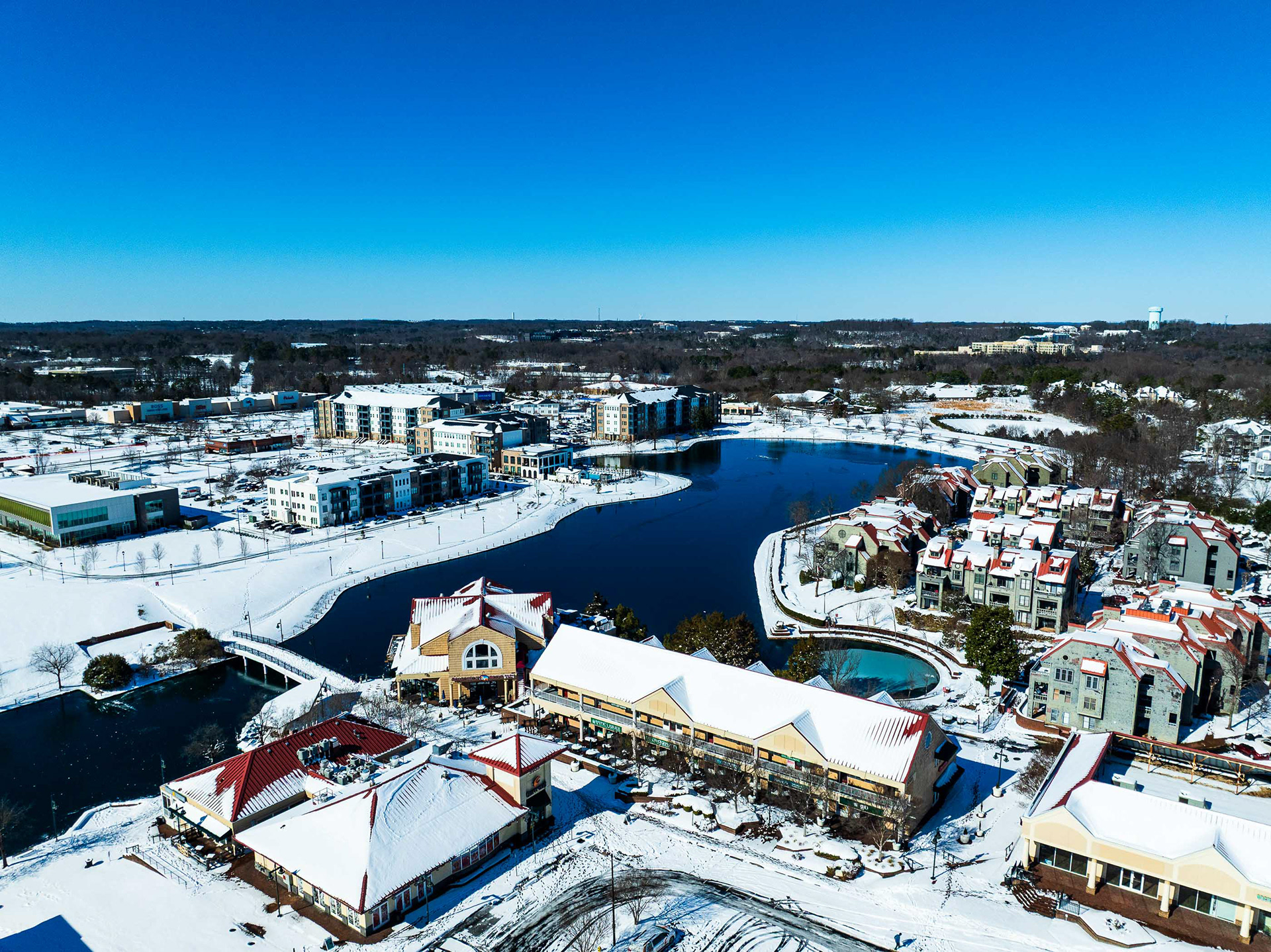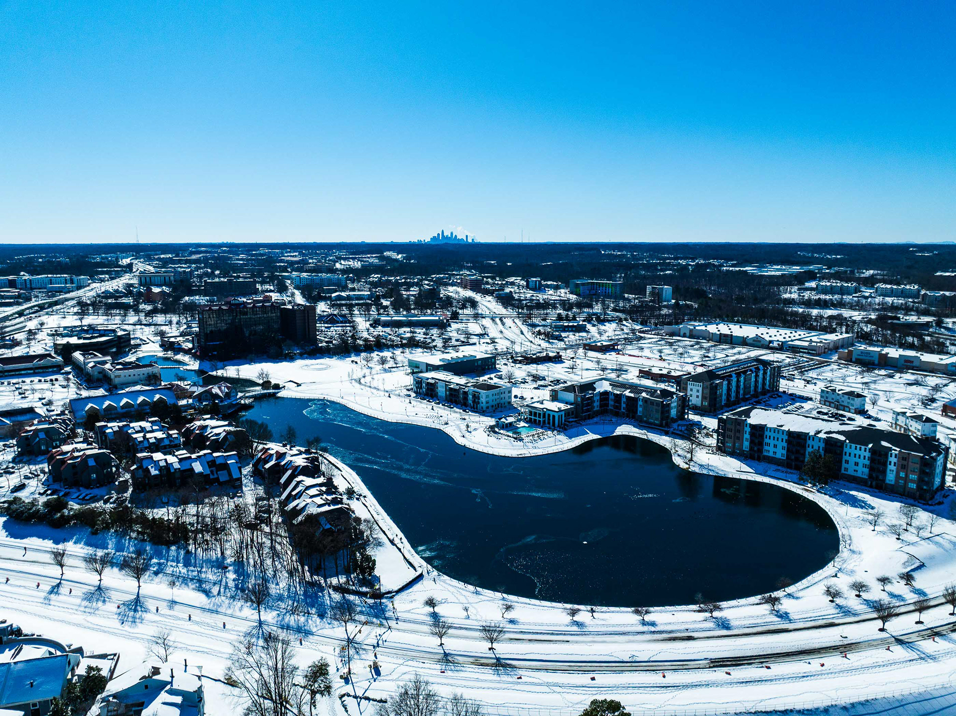 A professional aerial photography series capturing a rare, pristine snowfall across University City in Charlotte, North Carolina. This collection showcases the unique intersection of academic architecture, modern retail hubs, and serene lakeside living.